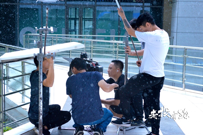 導(dǎo)演給群演們回看剛拍攝的鏡頭。