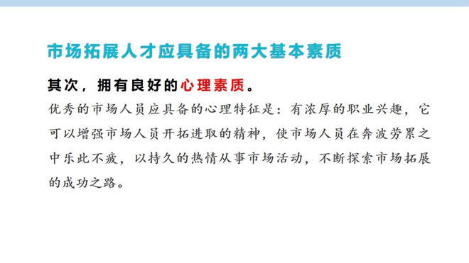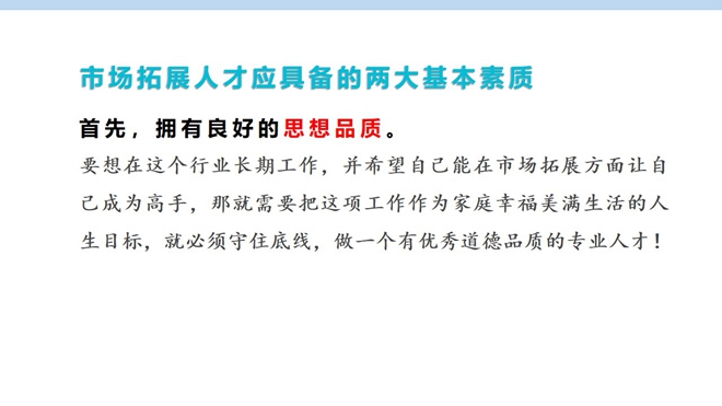 市場(chǎng)拓展人才專(zhuān)項(xiàng)培訓(xùn)則主要針對(duì)市場(chǎng)拓展人才應(yīng)具備的基本素質(zhì)和能力,市場(chǎng)拓展技巧,應(yīng)酬的七大黃金法則,如何更好地建立客戶(hù)管理體系。