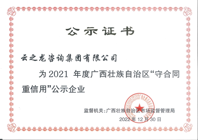 近日,從廣西壯族自治區(qū)市場監(jiān)督管理局官網(wǎng)獲悉,云之龍憑借規(guī)范經(jīng)營、嚴(yán)格管理、完善的信用體系建設(shè)以及多年來堅定執(zhí)行合同的契約精神,再度榮獲2021年度廣西“守合同重信用”企業(yè)稱號。